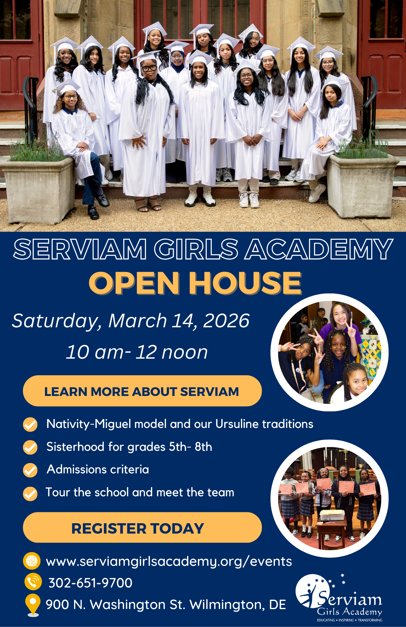About us: Serviam Girls Academy is a tuition-free, faith-based, private middle school in Wilmington, Delaware. Our multifaceted approach to learning and personal development ensures our scholars are prepared for high school. Through rigorous academic coursework, diverse enrichments, and comprehensive graduate support, over 90% of Serviam graduates attend their first-choice high school!